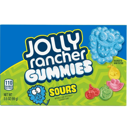 Jolly Rancher Sour Gummies 99 g obsahují výrazné chutě jako zelené jablko, modrou malinu, třešeň, citron a meloun – vše v kyselém cukrovém obalu. 9 žvýkaček má přibližně 110 kcal, balení je uzavíratelné a ideální třeba na film nebo svačinu