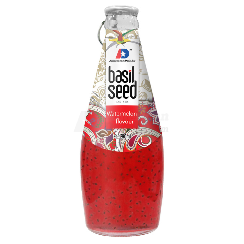 Basil Seed Drink – Watermelon is a refreshing non-carbonated beverage infused with real basil seeds and juicy watermelon flavor. This 290 ml glass bottle delivers a sweet, tropical taste with a unique texture from floating basil seeds – fun to drink and naturally hydrating.